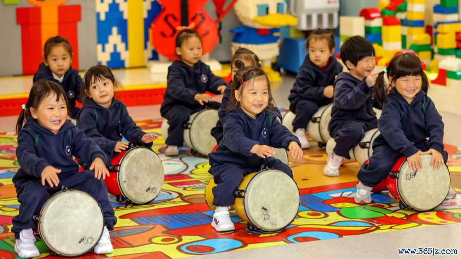 在山东青岛恒星科技学院恒星托育中心,真挚教托育班的小一又友学习非洲饱读。| 新华社发(张鹰 摄)